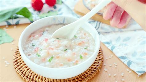 3、把糯米下锅煮软后,再加入基围虾、猪肉和胡萝卜丁,一起煮熟后撒入葱花即可食用。