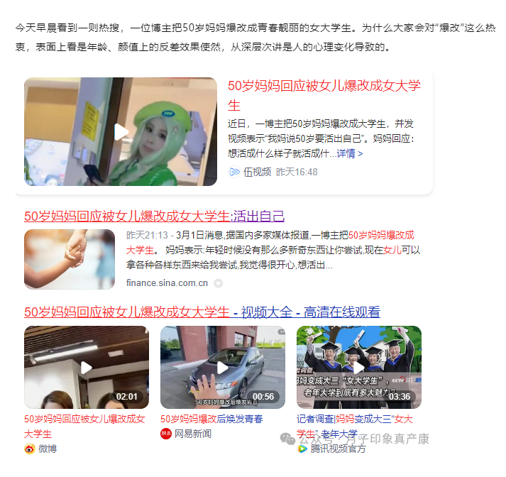 今天早晨看到一则热搜,一位博主把50岁妈妈爆改成青春靓丽的女大学生。为什么大家会对“爆改”这么热衷,表面上看是年龄、颜值上的反差效果使然,从深层次讲是人的心理变化导致的。