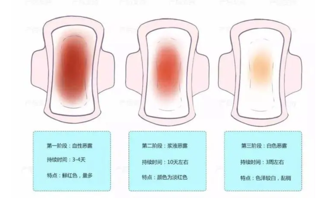 恶露一般分为三个阶段:血性恶露、浆液恶露、白色恶露。